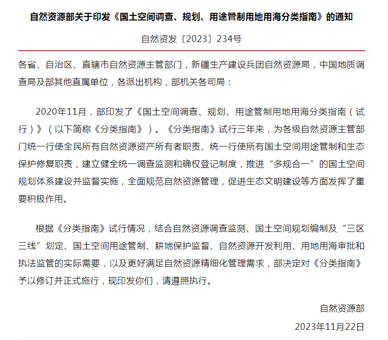 經(jīng)過(guò)三年試行,近日,自然資源部印發(fā)《國(guó)土空間調(diào)查、規(guī)劃、用途管制用地用海分類(lèi)指南》。