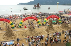 朱家尖最著名的景區“十里金沙”總長6.3千米,面積1.44平方千米,沙灘坡度2-5度,小于2米水深海域面積3.26平方千米,延綿在島東北至東南海岸。這里是理想的水上運動場所,可開設一次性能容納十萬游客的海濱浴場,也是進行駕艇飛舟、帆板穿浪、沙灘球類等運動的優良場地。朱家尖的沙灘平坦寬闊,沙質細膩柔純,是制作沙雕作品的理想材料。從1999年開始,每年都要在南沙景區舉辦中國舟山國際沙雕節,迎來無數的游客。