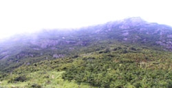 由石門頭繞過石門峰,只見四面群峰橫空,層巒疊嶂。左側陡峭的山巔上矗立著一座花崗巖形成的石臺,臺長約50米,寬約40米,高4—20米參差不齊。據稱這里是當年的明軍抗擊倭寇的石堡遺址。