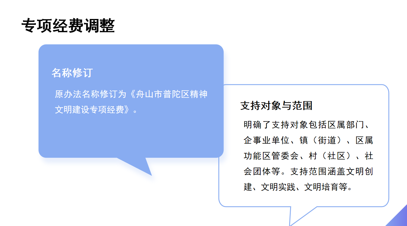 同時對專項經(jīng)費的重點支持范圍進行了提煉概括,主要包括:全區(qū)文明創(chuàng)建、文明培育、文明實踐等。新增“上級部門和區(qū)委、區(qū)政府確定的需要支持的重點項目和特殊事項”條款。