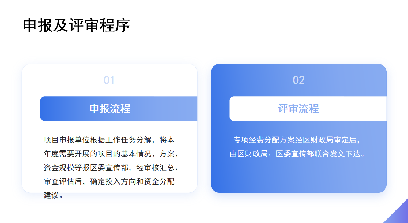2.評審程序:專項經(jīng)費分配方案經(jīng)區(qū)財政局按照相關程序?qū)彾ê螅蓞^(qū)財政局、區(qū)委宣傳部聯(lián)合發(fā)文下達至項目實施單位。