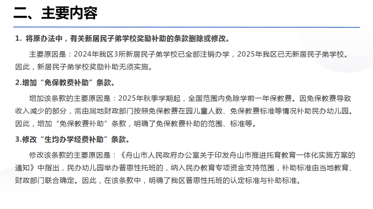 修改該條款的主要原因是:《舟山市人民政府辦公室關于印發舟山市推進托育教育一體化實施方案的通知》中指出,民辦幼兒園舉辦普惠性托班的,納入民辦教育專項資金支持范圍,補助標準由當地教育、財政部門聯合確定。因此,在該條款中,明確了我區普惠性托班的認定標準與補助標準。