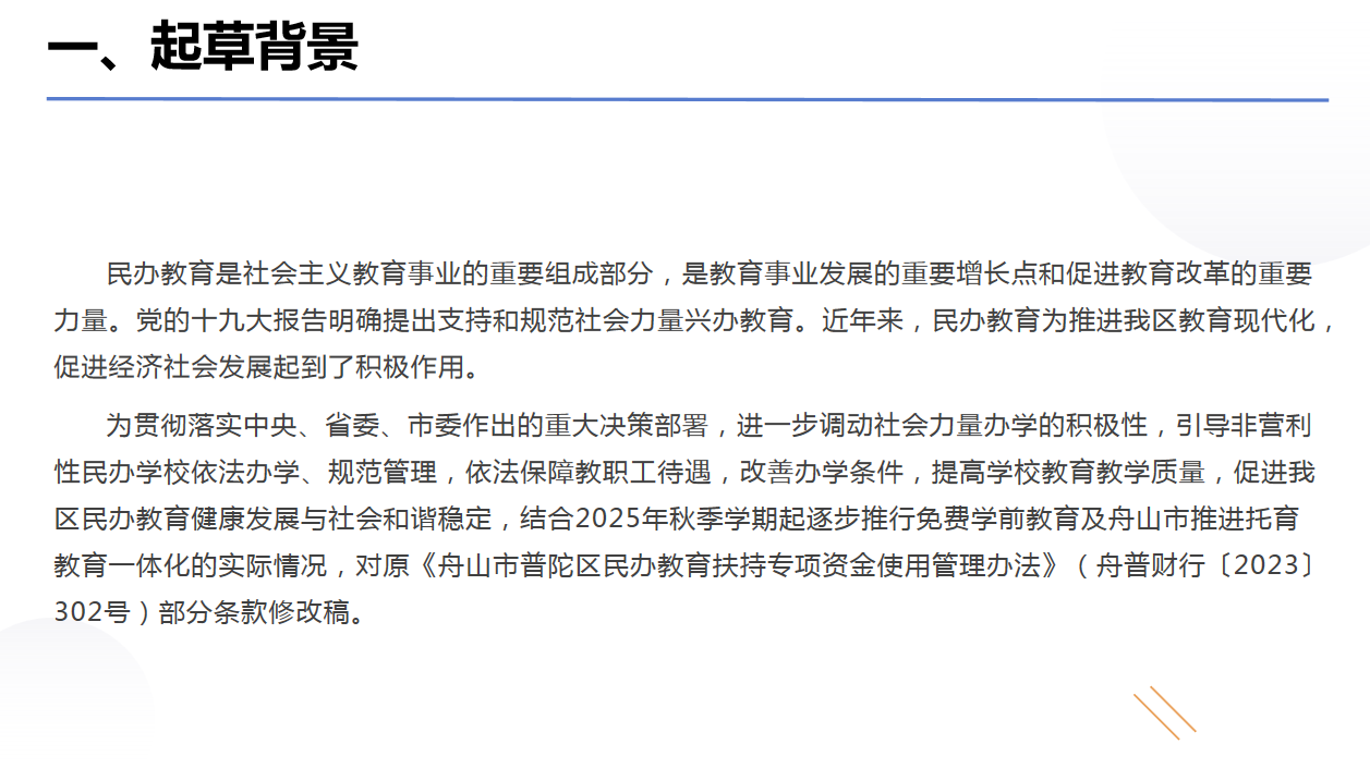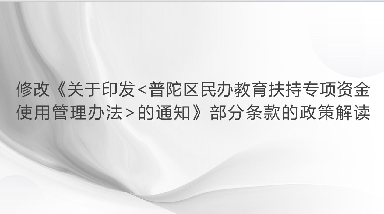 為貫徹落實中央、省委、市委作出的重大決策部署,進一步調動社會力量辦學的積極性,引導非營利性民辦學校依法辦學、規范管理,依法保障教職工待遇,改善辦學條件,提高學校教育教學質量,促進我區民辦教育健康發展與社會和諧穩定,結合2025年秋季學期起逐步推行免費學前教育及舟山市推進托育教育一體化的實際情況,對原《舟山市普陀區民辦教育扶持專項資金使用管理辦法》(舟普財行〔2023〕302號)部分條款修改稿。