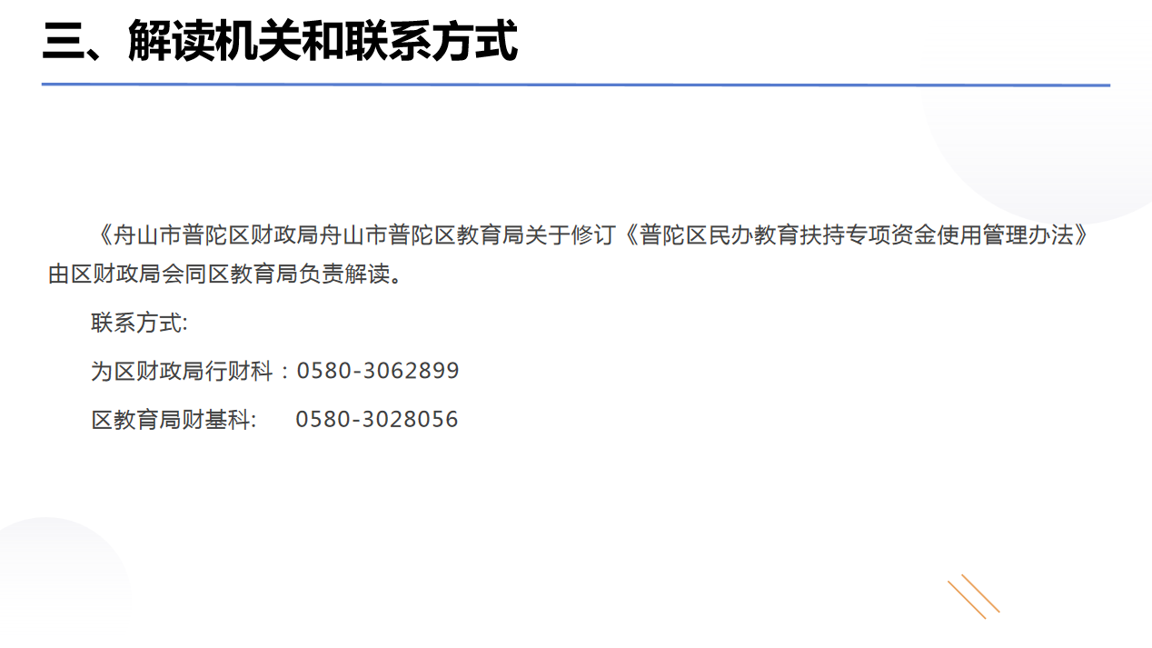 《舟山市普陀區財政局舟山市普陀區教育局關于修訂《普陀區民辦教育扶持專項資金使用管理辦法》由區財政局會同區教育局負責解讀,具體聯系方式為區財政局行財科徐女士:0580-3062899;區教育局財基科鄭先生,電話:0580-3028056。