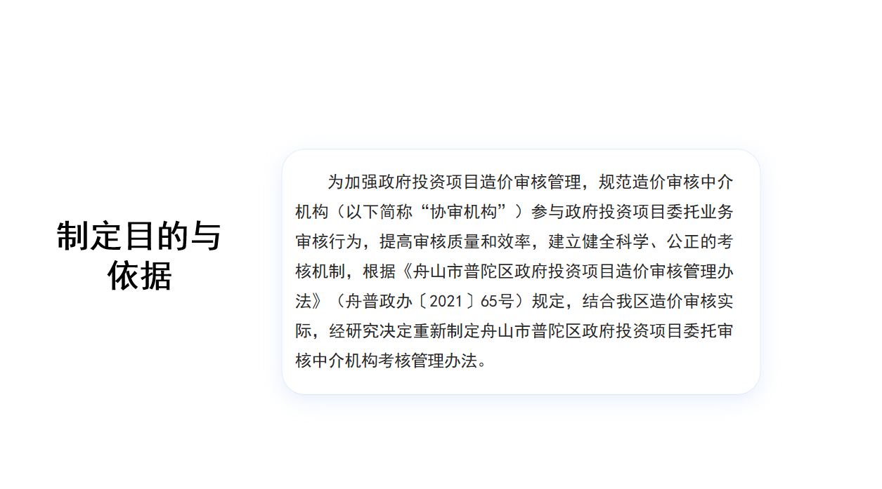 為加強政府投資項目造價審核管理,規(guī)范造價審核中介機構(gòu)(以下簡稱“協(xié)審機構(gòu)”)參與政府投資項目委托業(yè)務審核行為,提高審核質(zhì)量和效率,建立健全科學、公正的考核機制,根據(jù)《舟山市普陀區(qū)政府投資項目造價審核管理辦法》(舟普政辦〔2021〕65號)規(guī)定,結(jié)合我區(qū)造價審核實際,經(jīng)研究決定重新制定舟山市普陀區(qū)政府投資項目委托審核中介機構(gòu)考核管理辦法。