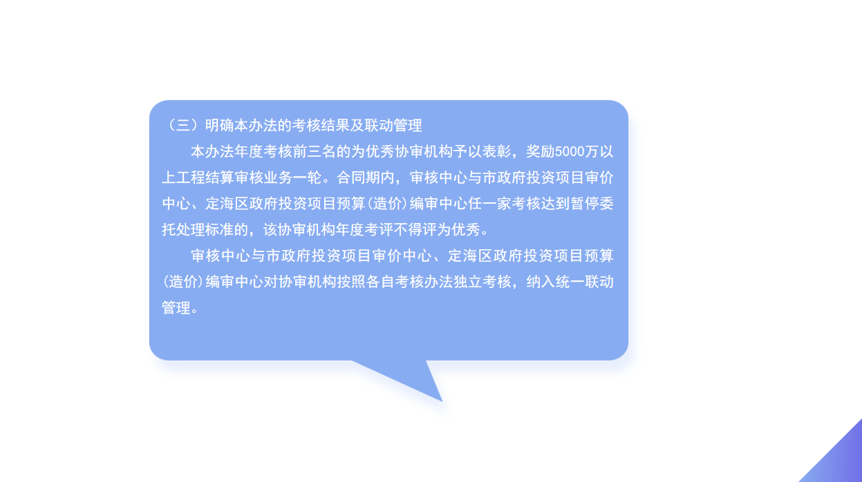 本辦法年度考核前三名的為優(yōu)秀協(xié)審機構(gòu)予以表彰,獎勵5000萬以上工程結(jié)算審核業(yè)務一輪。合同期內(nèi),審核中心與市政府投資項目審價中心、定海區(qū)政府投資項目預算(造價)編審中心任一家考核達到暫停委托處理標準的,該協(xié)審機構(gòu)年度考評不得評為優(yōu)秀。