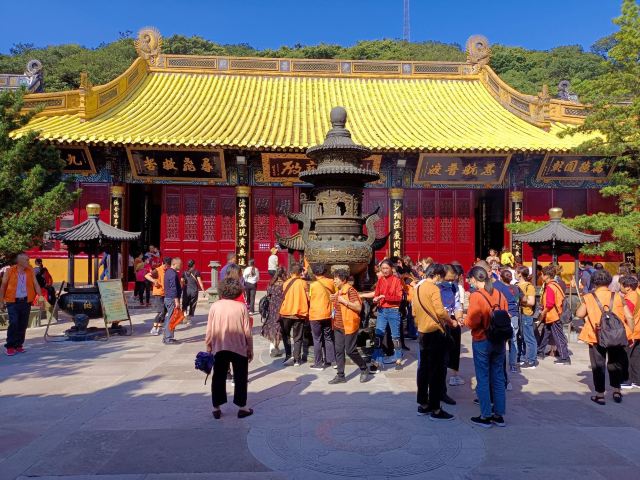 普陀山位于舟山群島東南部,是全國首批確定的44個國家級重點風景名勝區,與五臺、峨眉、九華并稱為中國四大佛教名山,古人譽為“海天佛國”。清康有為有詩贊曰:“觀音過此不肯去,海上神山涌普陀。樓閣高低二百寺,魚龍轟卷萬千波。”它以優美的海洋景觀和深厚的佛教文化蜚聲海內外,氣候清新溫和宜人。 普濟禪寺又稱前寺,為普陀山供奉觀音主剎,屬全國重點寺院。該寺前身是后梁貞明二年(916)始建之不肯去觀音院。寺院占地37019平方米。主殿大圓通殿宏大巍峨,百人共入不覺寬,千人齊登不覺擠,有“活大殿”之稱。 多寶塔取《法華經》多寶佛塔之義定名,呈方形,共五層,高18米,用太湖石砌成。系元代元統年間(1333-1334)宣讓王為普陀山僧孚中禪師所建,故又名為太子塔,該塔富有元代風格,是普陀山三寶之一。“多寶聞鐘”又為普陀一景。