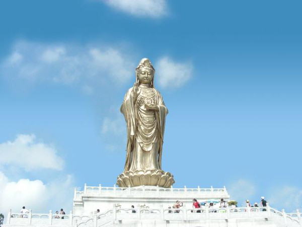 南海觀音大佛建在龍灣崗上,1997年10月30日建成,舉行隆重的開光儀式。佛像高33米,其中臺基高13米。大佛材料采用特殊的亞金銅,溶入佛面黃金6500克。中國佛教協會會長趙樸初為“南海觀音”題字。 不肯去觀音院 后梁貞明二年,有日本僧人慧鍔從五臺山得觀音佛像加國,途經普陀蓮花洋,遇風受阻,慧鍔以為觀音不愿去日本,由潮音洞旁登岸,當地張姓居民捨宅供奉這尊觀音佛像,這就稱“不肯去觀音院”。