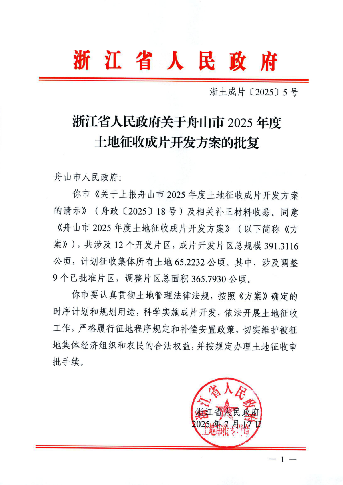 浙江省人民政府關于舟山市2025年度土地征收成片開發方案的批復